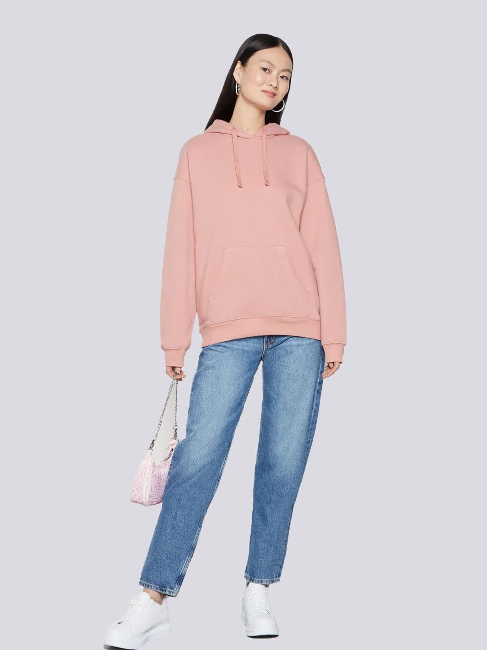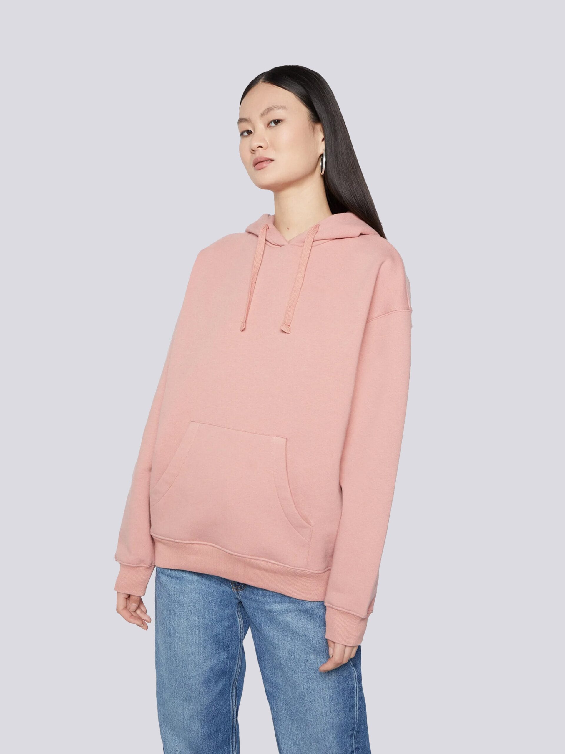 Hoodie in Heavy 300GSM made from a cotton blend fleece fabric. Relaxed fit , double hood, a kangaroo pocket, long sleeves and wide ribbing at the cuffs and hem. Soft brushed inside.