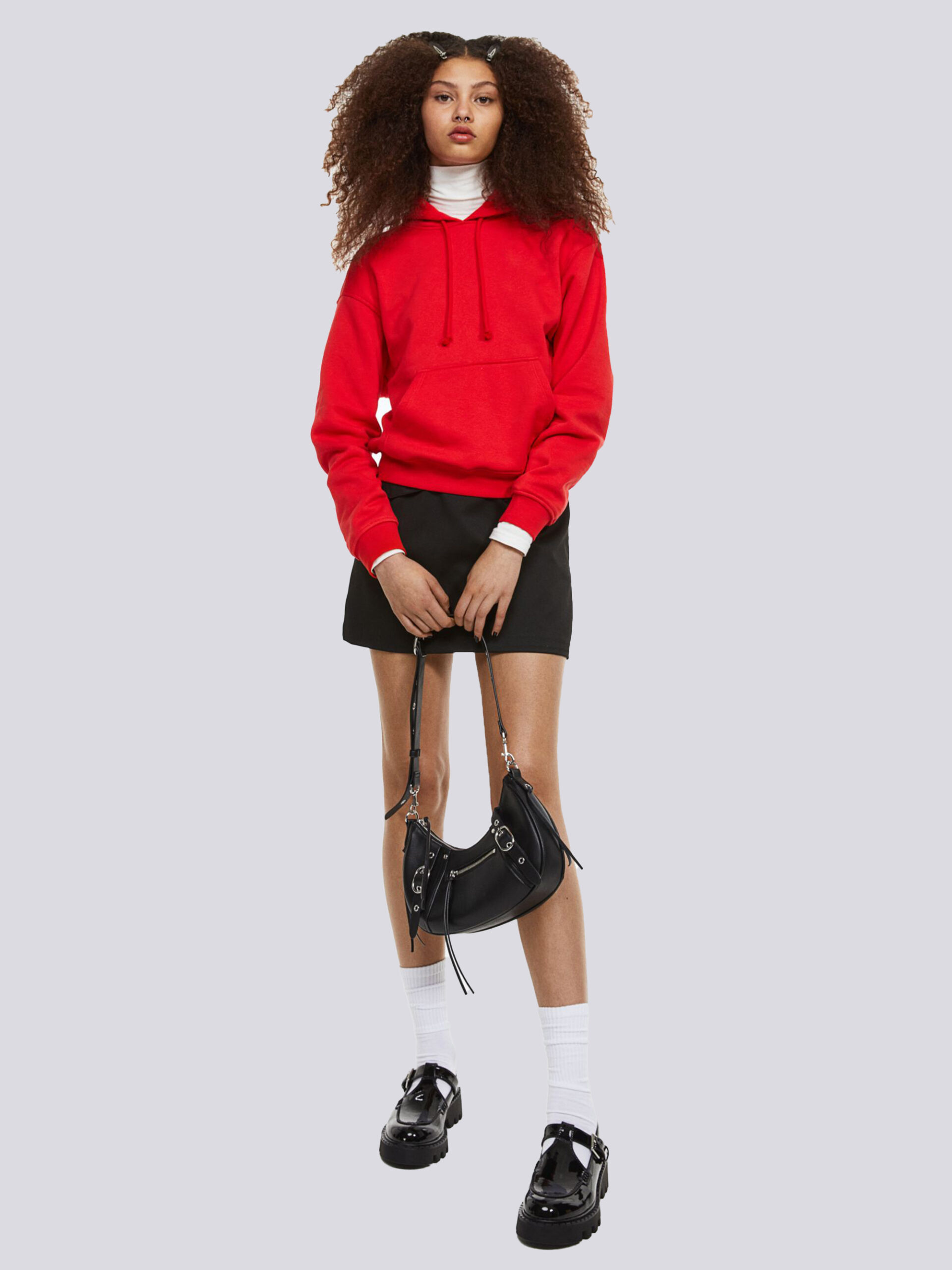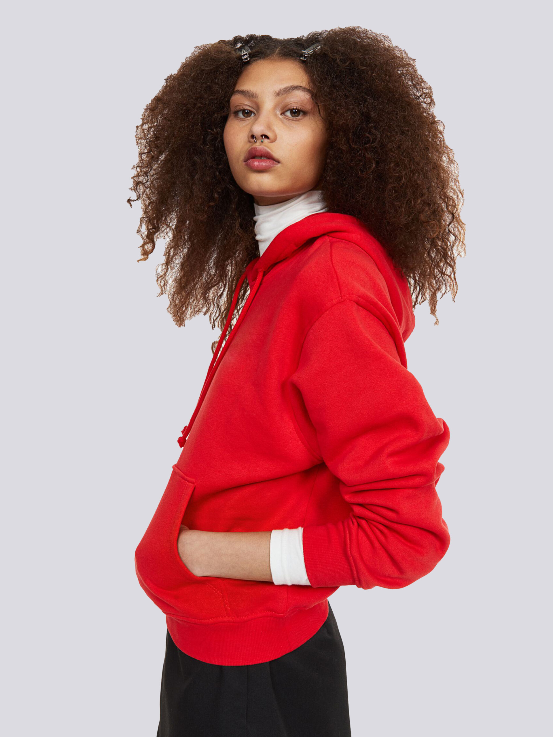 Hoodie in Heavy 300GSM made from a cotton blend fleece fabric. Relaxed fit , double hood, a kangaroo pocket, long sleeves and wide ribbing at the cuffs and hem. Soft brushed inside.